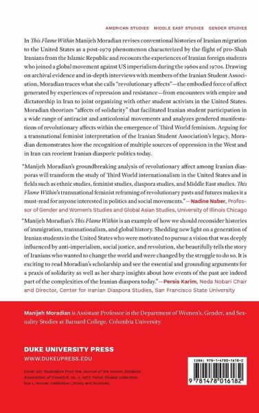 In This Flame Within Manijeh Moradian revises conventional histories of Iranian migration to the United States as a post-1979 phenomenon characterized by the flight of pro-Shah Iranians from the Islamic Republic and recounts the experiences of Iranian foreign students who joined a global movement against US imperialism during the 1960s and 1970s. Drawing on archival evidence and in-depth interviews with members of the Iranian Students Association, Moradian traces what she calls "revolutionary affects"-the embodied force of affect generated by experiences of repression and resistance-from encounters with empire and dictatorship in Iran to joint organizing with other student activists in the United States. Moradian theorizes "affects of solidarity" that facilitated Iranian student participation in a wide range of antiracist and anticolonial movements and analyzes gendered manifestations of revolutionary affects within the emergence of Third World feminism. Arguing for a transnational feminist interpretation of the Iranian Student Association's legacy, Moradian demonstrates how the recognition of multiple sources of oppression in the West and in Iran can reorient Iranian diasporic politics today.