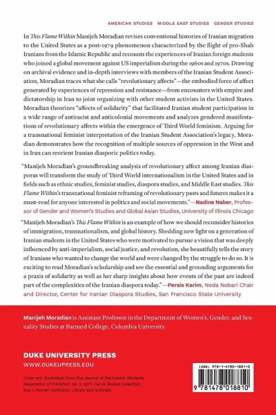 In This Flame Within Manijeh Moradian revises conventional histories of Iranian migration to the United States as a post-1979 phenomenon characterized by the flight of pro-Shah Iranians from the Islamic Republic and recounts the experiences of Iranian foreign students who joined a global movement against US imperialism during the 1960s and 1970s. Drawing on archival evidence and in-depth interviews with members of the Iranian Students Association, Moradian traces what she calls "revolutionary affects"-the embodied force of affect generated by experiences of repression and resistance-from encounters with empire and dictatorship in Iran to joint organizing with other student activists in the United States. Moradian theorizes "affects of solidarity" that facilitated Iranian student participation in a wide range of antiracist and anticolonial movements and analyzes gendered manifestations of revolutionary affects within the emergence of Third World feminism. Arguing for a transnational feminist interpretation of the Iranian Student Association's legacy, Moradian demonstrates how the recognition of multiple sources of oppression in the West and in Iran can reorient Iranian diasporic politics today.