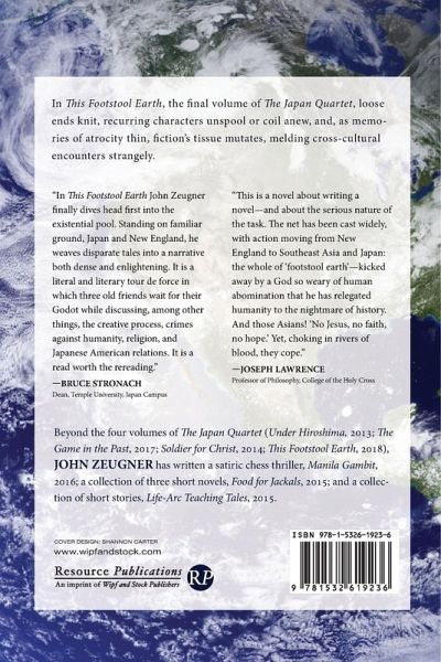 Beyond the four volumes of The Japan Quartet (Under Hiroshima, 2013; The Game in the Past, 2017; Soldier for Christ, 2014; This Footstool Earth, 2018), John Zeugner has written a satiric chess thriller, Manila Gambit, 2016; a collection of three short novels, Food for Jackals, 2015; and a collection of short stories, Life-Arc Teaching Tales, 2015.