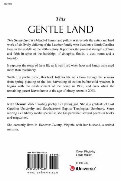 This Gentle Land is a blend of humor and pathos as it records the antics and hard work of six lively children of the Lassiter family who lived on a North Carolina farm in the middle of the 20th century. It portrays the parental strengths of love and faith in spite of the hardships of droughts, floods, a dust storm and a tornado. It captures the sense of farm life as it was lived when hoes and hands were used more than machinery. Written in poetic prose, this book follows life on a farm through the seasons from spring planting to the last harvesting of cotton before cold weather. It begins with the establishment of the home in 1930, and ends when the remaining parent leaves home at the age of ninety-seven in 2003.