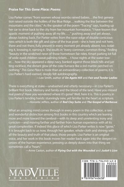 Lisa Parker comes "from women whose wombs rained babies...the first generation raised outside the hollers of the Blue Ridge...walking the line between the mountains and the cities." As the speaker of the poem "Tracing" says, loading up her car to drive back to the city from her mountain homeplace, "I have known that spastic moment of pushing away all my life...," pushing away and yet always, always looking back. For Parker writes from the razor edge of double consciousness which is both the gift and curse of the true poet-she is here and not here, there and not there, fully present in every moment yet already absent, too, isolating it, knowing it, naming it. She exults in "every common, common thing," finding "beauty in the scratched neon of those hometown fair rides, Kmart parking lot full of wide-eyed children sweat-palming tickets...those nights at the water tower...how the sky appeared a deep navy, banked against those black hills and jutting rockface, the distant glow of the coke furnace like a red marble perched on nothing." This Gone Place is more than an extraordinary collection of poems; it is Lisa Parker's hard-earned, deeply felt autobiography.-Lee Smith, author of On Agate Hill and Fair and Tender Ladies