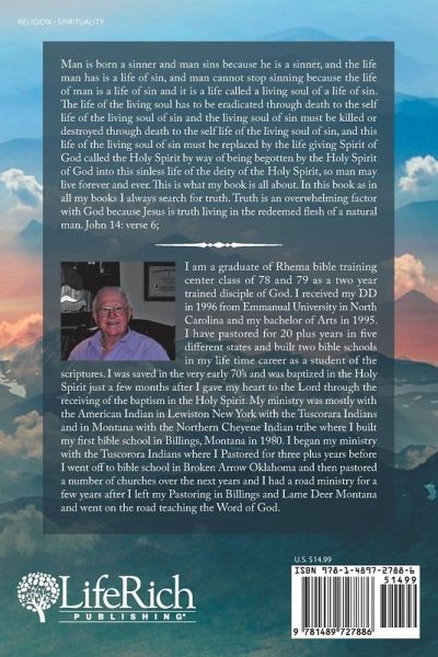 Man is born a sinner and man sins because he is a sinner, and the life man has is a life of sin, and man cannot stop sinning because the life of man is a life of sin and it is a life called a living soul of a life of sin. The life of the living soul has to be eradicated through death to the self life of the living soul of sin and the living soul of sin must be killed or destroyed through death to the self life of the living soul of sin, and this life of the living soul of sin must be replaced by the life giving Spirit of God called the Holy Spirit by way of being begotten by the Holy Spirit of God into this sinless life of the deity of the Holy Spirit, so man may live forever and ever. This is what my book is all about. In this book as in all my books I always search for truth. Truth is an overwhelming factor with God because Jesus is truth living in the redeemed flesh of a natural man. John 14: verse 6;