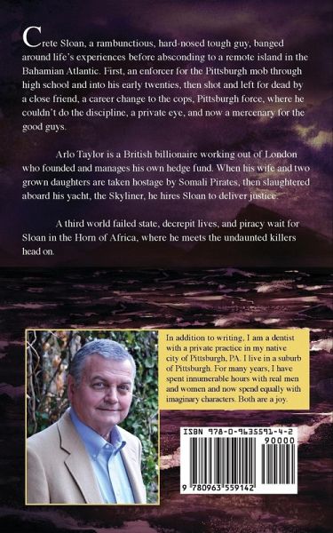 Crete Sloan, a rambunctious, hard-nosed tough guy, banged around life's experiences before absconding to a remote island in the Bahamian Atlantic. First, as an enforcer for the Pittsburgh mob through high school and into his early twenties, then shot and left for dead by a close friend, a career change to the Pittsburgh cops, where he couldn't do the discipline, then a private eye, and now a mercenary for the good guys. Arlo Taylor is a British billionaire working out of London whose wife and two grown daughters are slaughtered aboard his yacht, the Skyliner, by Somali Pirates. He hires Sloan to deliver justice. Sloan's search for the murderous pirates takes him from his island in the Bahamas to London, the Netherlands, France, and Africa. Along the way, he grapples with Taylor's bodyguard, Sir Humphrey Bellingham, who wants Sloan off the case and finds an ally in Captain Ellis Gordon, the commander of the Lemonnier naval base in Djibouti. Gordon warns Sloan that should he pursue the case into Somalia, he stands no chance of returning alive. Sloan can't run, won't turn tail, never has. He pursues justice for Arlo Taylor and lands finally in Somalia without a clue as to whom the pirates are, what they look like, or where to find them. A third world failed state, decrepit lives, and piracy wait for Sloan in the Horn of Africa, where he meets the undaunted killers head on.