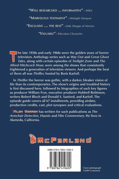 The late 1950s and early 1960s were the golden years of horror television. Anthology series such as Way Out and Great Ghost Tales, along with certain episodes of Twilight Zone and The Alfred Hitchcock Hour, were among the shows that consistently frightened a generation of television viewers. And perhaps the best of them all was Thriller, hosted by Boris Karloff. In Thriller the horror was gothic, with a darker, bleaker vision of life than its contemporaries. The show's origins and troubled history is first discussed here, followed by biographies of such key figures as producer William Frye, executive producer Hubbell Robinson, writers Robert Bloch and Donald S. Sanford, and Karloff. The episode guide covers all 67 installments, providing airdate, production credits, cast, plot synopses and critical evaluations.