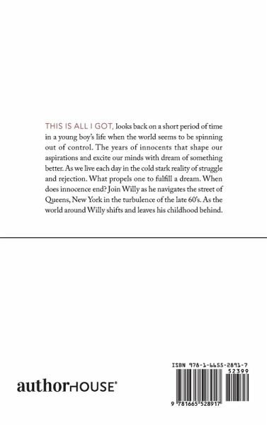 This Is All I Got, looks back on a short period of time in a young boy's life when the world seems to be spinning out of control. The years of innocents that shape our aspirations and excite our minds with dream of something better. As we live each day in the cold stark reality of struggle and rejection. What propels one to fulfill a dream. When does innocence end? Join Willy as he navigates the street of Queens, New York in the turbulence of the late 60's. As the world around Willy shifts and leaves his childhood behind.