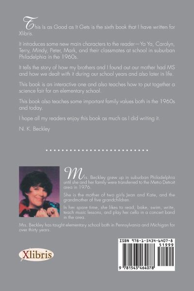 This Is as Good as It Gets is the sixth book that I have written for Xlibris. It introduces some new main characters to the reader—Ya Ya, Carolyn, Terry, Mindy, Peter, Mark, and their classmates at school in suburban Philadelphia in the 1960s. It tells the story of how my brothers and I found out our mother had MS and how we dealt with it during our school years and also later in life. This book is an interactive one and also teaches how to put together a science fair for an elementary school. This book also teaches some important family values both in the 1960s and today. I hope all my readers enjoy this book as much as I did writing it. N. K. Beckley