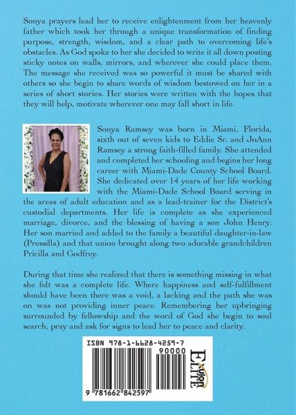 Sonya prayers lead her to receive enlightenment from her heavenly father which took her through a unique transformation of finding purpose, strength, wisdom, and a clear path to overcoming life's obstacles. As God spoke to her she decided to write it all down posting sticky notes on walls, mirrors, and wherever she could place them. The message she received was so powerful it must be shared with others so she begin to share words of wisdom bestowed on her in a series of short stories. Her stories were written with the hopes that they will help, motivate wherever one may fall short in life. Sonya Ramsey was born in Miami, Florida, sixth out of seven kids to Eddie Sr. and JoAnn Ramsey a strong faith-filled family. She attended and completed her schooling and begins her long career with Miami-Dade County School Board. She dedicated over 14 years of her life working with the Miami-Dade School Board serving in the areas of adult education and as a lead-trainer for the District's custodial departments. Her life is complete as she experienced marriage, divorce, and the blessing of having a son John Henry. Her son married and added to the family a beautiful daughter-in-law (Pressilla) and that union brought along two adorable grandchildren Pricilla and Godfrey. During that time she realized that there is something missing in what she felt was a complete life. Where happiness and self-fulfillment should have been there was a void, a lacking and the path she was on was not providing inner peace. Remembering her upbringing surrounded by fellowship and the word of God she begin to soul search, pray and ask for signs to lead her to peace and clarity.