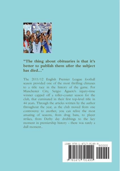 "The thing about obituaries is that it's better to publish them after the subject has died..." The 2011/12 English Premier League football season provided one of the most thrilling climaxes to a title race in the history of the game. For Manchester City, Sergio Aguero's injury-time winner capped off a roller-coaster season for the club, that cuminated in their first top-level title in 44 years. Through the articles written by the author throughout the year, as the club moved from one controversy to another, you can relive the most amazing of seasons, from drug bans, to player strikes, from Derby day drubbings to the key moment in premiership history - there was rarely a dull moment..