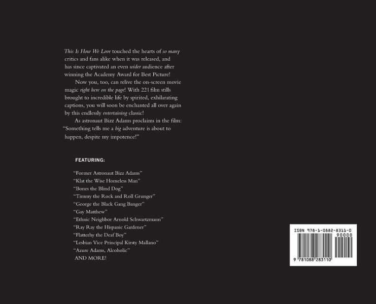 The 1994 movie This Is How We Love touched the hearts of so many critics and fans alike when it was released, and has since captivated an even wider audience after winning the Academy Award for Best Picture! Now you, too, can relive the on-screen movie magic right here on the page! With 221 film stills brought to incredible life by spirited, exhilarating captions, you will soon be enchanted all over again by this endlessly entertaining classic! As former astronaut Bizz Adams proclaims in the film: "Something tells me a big adventure is about to happen, despite my impotence!" This Is How We Love: The Foto-Novel (30th Anniversary Edition) Starring: Patton Oswalt - Klat the Homeless Man Chris Meloni - Bobby the NASCAR driver, son of Bizz and Azure, brother to Melissa Jon Hamm - former astronaut Bizz Adams Paul Reubens - Tony, Harold and Victor (and Reuben the director) Michael Ian Black - Timmy the Grunger, Eldest Son of Bobby Jo Firestone - Melissa Adams, stutterer, depressive, lesbian Tim Barnes - George the Black Gang Banger Laraine Newman and Amy Sedaris - Azure Adams Scott Rogowsky - Mathew Schwartzmann, Gay Son of Neighbor Kerri Kenney-Silver - Vice Principal AD Miles - Marcus the Thief Laura Krafft - Marcus's Mother Ted Travelstead - Flatterhy the Deaf Boy, Youngest Son of Bobby Shonali Bowhick - Vicky, Melissa Adams' roommate Dave Hill - Topper, Vicky's bike messenger boyfriend Al Madrigal - Peckerwood (Pecker for short) Seth Herzog - Nazi guard Fritz Kimmy Gatewood - Rachey, wife of Bobby Jen Spyra - Angel, wife of Hispanic gardener, Ray Ray Jordan Carlos - Ray Ray, the gardener Owen Kline - Manuel, schizophrenic son of Ray Ray and Angel Feel the This Is How We Love magic!