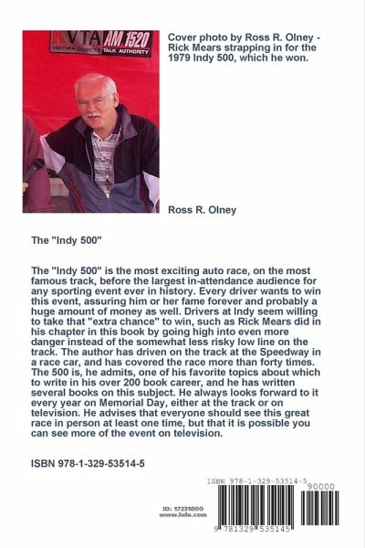 The "Indy 500" is the most exciting auto race, on the most famous track, before the largest in-attendance audience for any sporting event ever in history. Every driver wants to win this event, assuring him or her fame forever and probably a huge amount of money as well. Drivers at Indy seem willing to take that "extra chance" to win, such as Rick Mears did in his chapter in this book by going high into even more danger instead of the low, less risky line on the track. The author has driven on the track at the Speedway in a race car, and has covered the race more than forty times as a reporter. The 500 is, he admits, one of his favorite topics about which to write in his over 200 book career, and he has written several books on this subject. He always looks forward to it every year on Memorial Day, either at the track or on television. He advises that everyone should see this great race in person at least one time, but that it is possible you can see more of the event on television.