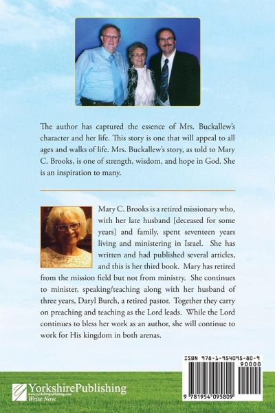 The author has captured the essence of Mrs. Buckallew's character and her life. This story is one that will appeal to all ages and walks of life. Mrs. Buckallew's story, as told to Mary C. Brooks, is one of the strength, wisdom, and hope in God. She is an inspiration to many.