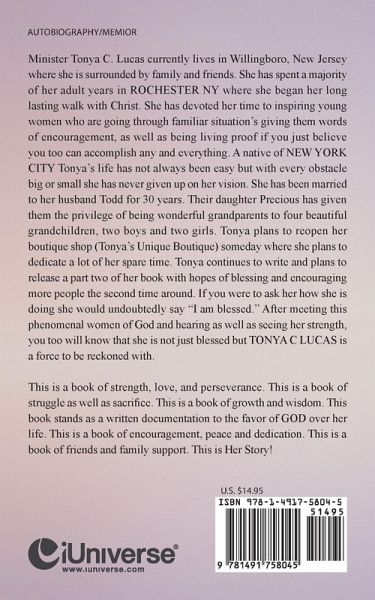 This is a book of strength, love, and perseverance. This is a book of struggle as well as sacrifice. This is a book of growth and wisdom. This book stands as a written documentation to the favor of GOD over her life. This is a book of encouragement, peace and dedication. This is a book of friends and family support. This is Her Story!
