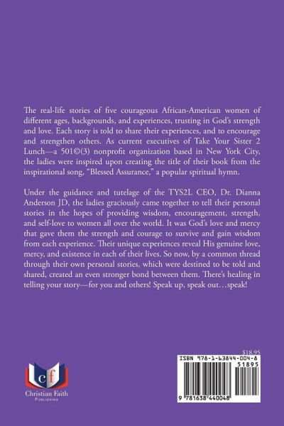 The real-life stories of five courageous African-American women of different ages, backgrounds, and experiences, trusting in God's strength and love. Each story is told to share their experiences, and to encourage and strengthen others. As current executives of Take Your Sister 2 Lunch--a 501(c)(3) nonprofit organization based in New York City, the ladies were inspired upon creating the title of their book from the inspirational song, "Blessed Assurance," a popular spiritual hymn. Under the guidance and tutelage of the TYS2L CEO, Dr. Dianna Anderson, JD, the ladies graciously came together to tell their personal stories in the hopes of providing wisdom, encouragement, strength, and self-love to women all over the world. It was God's love and mercy that gave them the strength and courage to survive and gain wisdom from each experience. Their unique experiences reveal His genuine love, mercy, and existence in each of their lives. So now, by a common thread through their own personal stories, which were destined to be told and shared, created an even stronger bond between them. There's healing in telling your story--for you and others! Speak up, speak out...speak!