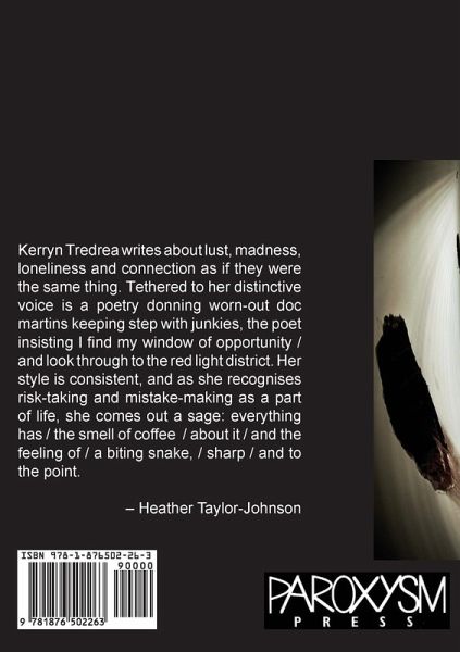 Kerryn Tredrea writes about lust, madness, loneliness and connection as if they were the same thing. Tethered to her distinctive voice is a poetry donning worn-out doc martins keeping step with junkies, the poet insisting i find my window of opportunity / and look through to the red light district. Her style is consistent, and as she recognises risk-taking and mistake-making as a part of life, she comes out a sage: everything has / the smell of coffee / about it / and the feeling of / a biting snake, / sharp / and to the point.