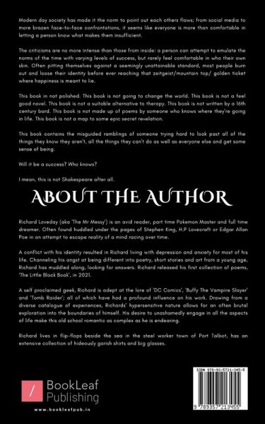 """"""Modern day society has made it the norm to point out each others flaws; from social media to more brazen face-to-face confrontations, it seems like everyone is more than comfortable in letting a person know what makes them insufficient. The criticisms are no more intense than those from inside: a person can attempt to emulate the norms of the time with varying levels of success, but rarely feel comfortable in who their own skin. Often pitting themselves against a seemingly unattainable standard, most people burn out and loose their identity before ever reaching that zeitgeist/mountain top/ golden ticket where happiness is meant to lie. This book in not polished. This book is not going to change the world. This book is not a feel good novel. This book is not a suitable alternative to therapy. This book is not written by a 16th century bard. This book is not made up of poems by someone who knows where they're going in life. This book is not a map to some epic secret revelation. This book contains the misguided ramblings of someone trying hard to look past all of the things they know they aren't, all the things they can't do as well as everyone else and get some sense of being. Will it be a success? Who knows? I mean, this is not Shakespeare after all. """"""