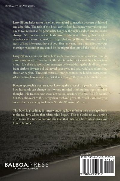 Larry Bilotta helps us see the often-overlooked connection between childhood and adult life. The title of this book comes from husbands who wake up one day to realize their wife's personality has gone through a sudden and traumatic change. She does not resemble the woman she was. Through his own life experience of a most traumatic marriage relationship, Bilotta gives us a revealing story of how life events, those of your first ten years, have a real effect on your marriage relationship and could be the trigger that sets off the midlife crisis. Larry Bilotta's stories and ideas help readers see how the subconscious mind is directly connected to how the midlife crisis is run by the ideas of the subconscious mind. It is these subconscious messages delivered during the childhood years from birth to 10 years old that reveal your own, and your wife's abandonment, abuse, or neglect. These subconscious stories contain the hidden instructions which control how your wife acts it all out through the years of her midlife crisis Bilotta's approach is not just about knowing the effect of the past, but also about how husbands can change their wrong minded thinking into right minded thought. He teaches how wives are natural reactors who react to life events, but they also react to the energy their husband gives off. You'll learn how you create that new energy in This is Not the Woman I Married. This book is a roadmap for men wondering how to bring their marriages back to the real love where that relationship began. This is a wake-up call, urging men to use this time to become the man that only pain-filled situations allow him to become.