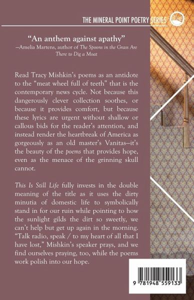"An anthem against apathy" -Amelia Martens, author of The Spoons in the Grass Are There to Dig a Moat Read Tracy Mishkin's poems as an antidote to the "meat wheel full of teeth" that is the contemporary news cycle. Not because this dangerously clever collection soothes, or because it provides comfort, but because these lyrics are urgent without shallow or callous bids for the reader's attention, and instead render the heartbreak of America as gorgeously as an old master's Vanitas-it's the beauty of the poems that provides hope, even as the menace of the grinning skull cannot. This Is Still Life fully invests in the double meaning of the title as it uses the dirty minutia of domestic life to symbolically stand in for our ruin while pointing to how the sunlight gilds the dirt so sweetly, we can't help but get up again in the morning. "Talk radio, speak / to my heart of all that I have lost," Mishkin's speaker prays, and we find ourselves praying, too, while the poems work polish into our hope.