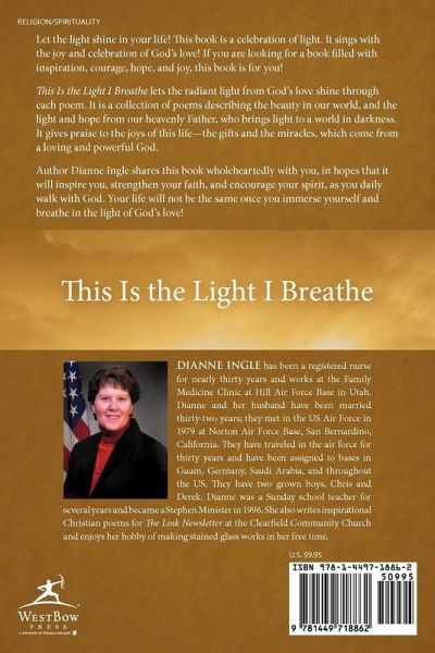 Let the light shine in your life! This book is a celebration of light. It sings with the joy and celebration of God's love! If you are looking for a book filled with inspiration, courage, hope, and joy, this book is for you! T his Is the Light I Breathe lets the radiant light from God's love shine through each poem. It is a collection of poems describing the beauty in our world, and the light and hope from our heavenly Father, who brings light to a world in darkness. It gives praise to the joys of this life-the gifts and the miracles, which come from a loving and powerful God. Author Dianne Ingle shares this book wholeheartedly with you, in hopes that it will inspire you, strengthen your faith, and encourage your spirit, as you daily walk with God. Your life will not be the same once you immerse yourself and breathe in the light of God's love!