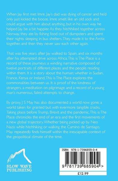 When Jay first met Imre, Jay's dad was dying of cancer and he'd only just kicked the booze. Imre smelt like an old sock and could argue with him about anything, but in his own way he helped Jay be a bit happier. As they hitchhiked together across Norway, they ate by fishing food out of dumpsters and spent their nights sleeping in bus shelters. They made it to the Arctic together, and then they never saw each other again. That was five years after Jay walked to Spain, and six months after his attempted drive across Africa. This is The Place is a record of these journeys: a winding narrative composed of twelve portraits of different places and the people residing within them. It is a story about the human; whether in Sudan, France, Kenya or Ireland, This is The Place explores the commonalities between us. It is proof of the kindness of strangers, a meditation on pilgrimage and a record of a young man's numerous, failed attempts to change. By proxy, J S May has also documented a world now gone; a world taken for granted but with evermore tangible cracks. Taking place before Trump, Brexit and the pandemic, This is The Place chronicles the end of an era and the first movements of a new global trajectory. Whether being picked up by Neo Nazis while hitchhiking or walking the Camino de Santiago, May repeatedly finds himself within the inescapable context of the geopolitical climate of the time.