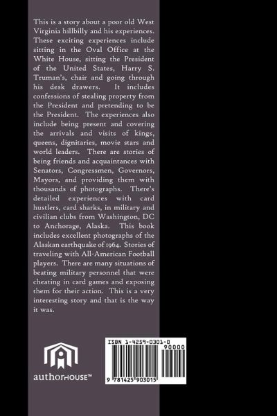 This is a story about a poor old West Virginia hillbilly and his experiences. These exciting experiences include sitting in the Oval Office at the White House, sitting the President of the United States, Harry S. Truman's, chair and going through his desk drawers. It includes confessions of stealing property from the President and pretending to be the President. The experiences also include being present and covering the arrivals and visits of kings, queens, dignitaries, movie stars and world leaders. There are stories of being friends and acquaintances with Senators, Congressmen, Governors, Mayors, and providing them with thousands of photographs. There's detailed experiences with card hustlers, card sharks, in military and civilian clubs from Washington, DC to Anchorage, Alaska. This book includes excellent photographs of the Alaskan earthquake of 1964. Stories of traveling with All-American Football players. There are many situations of beating military personnel that were cheating in card games and exposing them for their action. This is a very interesting story and that is the way it was.