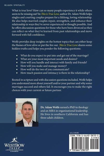 What is true love? How can so many people experience it while others seem to be missing out? In This is True Love, author Dr. Adam Wolfe helps singles and courting couples prepare for a lifelong, loving relationship. He also helps married couples repair, strengthen, and enhance their relationship in ways they've never experienced or thought possible. And he offers discussion questions for those who have been divorced so they can reflect on what they've learned from past relationships and move forward with full confidence. Wolfe provides deep insights on the hottest topics that can either keep the flames of love alive or put the fire out. This is True Love shares some hidden truths and helps you ponder the following questions: What do you expect to put into and get out of the marriage? What are your most important needs and desires? How will you handle and interact with family and friends? How will you make and manage money? How well do the two of you communicate? How much passion and intimacy is there in the relationship? Rooted in scripture and with discussion questions included, Wolfe helps you understand more about yourself and/or your partner and why some marriages succeed and others fail. It encourages you to make the right choices with your current or future partner.
