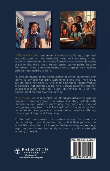 Unveil the Wonders of Being Different: A Heartwarming Journey of Acceptance, Friendship, and the Joy of Embracing Individuality for Young Minds. Welcome to the captivating world of This Is Who I Am, a story that resonates with every child's quest to find their place in the vast tapestry of life. Designed for children aged 8 and up, this book transcends boundaries, appealing to both regularly developed children and those with exceptional needs, including autism. It's a tale that celebrates diversity, speaking to kids of all races and backgrounds. Meet Soraya, a bright and curious second-grader, whose journey unfolds in the classrooms and playgrounds where every child learns and grows. Soraya faces a challenge familiar to many: she's teased for being different. Her story is one of silent struggle, the quest to fit in, and the deep desire to be accepted by her peers. But This Is Who I Am is more than just a story of challenges; it's a beacon of hope and understanding. A turning point in Soraya's life brings a profound realization - her uniqueness is not a weakness but a superpower. The book weaves this powerful message through a narrative that is both engaging and educational. As Soraya learns to embrace her individuality, she teaches readers the value of self-acceptance and the strength found in diversity. This book is an inspiring call to celebrate our differences and find unity in them. Perfect for parents, educators, and children alike, This Is Who I Am is more than just a book; it's a journey towards understanding and kindness. It's an essential addition to any young reader's library, promising not only a compelling story but also a life lesson that will stay with them forever. Embrace this journey with Soraya and discover the magic in being uniquely you!