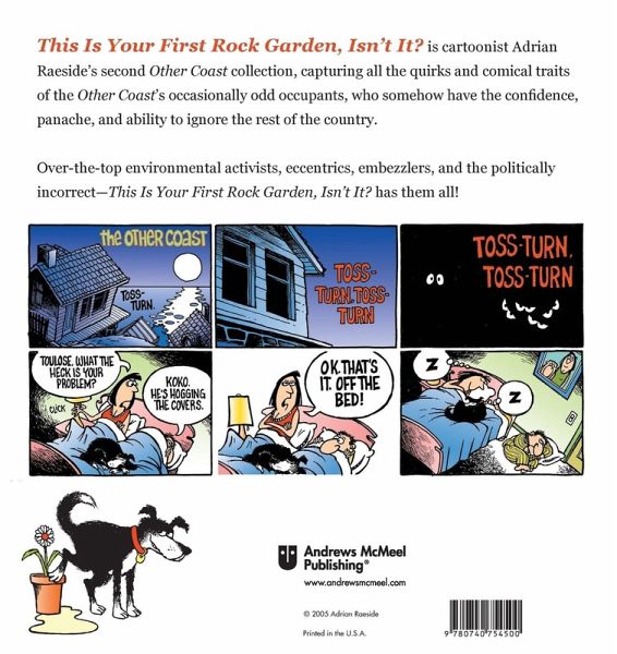 It's different "over there." Everybody east of Washington, Oregon, and California knows it. But defining the West Coast as "not like the East Coast" leaves way too much of the story untold. No, far better to turn to Adrian Raeside's This Is Your First Rock Garden, Isn't It?, perhaps one of the most informative -and certainly funniest-explanations to ever depict the westernmost portion of our country. Raeside represents the perfect comic commentator on what makes "Other Coasters" tick. He was born a Kiwi, lived in England, and now resides in British -close enough for a good view without having to get mixed up in the muddle that passes for the West Coast lifestyle and its many subcultures. Instead, the cartoonist accurately sheds light and humor on residents who put their own unique spin on everything from cars and coffee to extreme sports and the latest out-there technology.