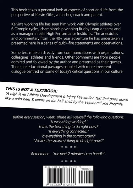 This book takes a personal look at aspects of sport and life from the perspective of Kelvin Giles, a teacher, coach and parent. Kelvin's working life has seen him work with Olympic athletes over 6 Olympic cycles; championship winning Rugby League teams and as a manager in elite High Performance Institutes. The anecdotes and commentary from the 40+ year adventure he has undertaken is presented here in a series of quick-fi re statements and observations. Some text is taken directly from communications with organisations, colleagues, athletes and friends. Other comments are from people admired and followed by the author and presented as their quotes. There are educational passages coupled with more irreverent dialogue centred on some of today's critical questions in our culture.