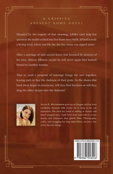 Haunted by the tragedy of that morning, Jubilee can't help but question the truths etched into her heart since birth. If God is truly a loving God, where was He the day her virtue was ripped away? After a marriage of dark secrets leaves him haunted by demons of his own, Atticus Albanus swears he will never again find himself bound to another woman. That is, until a proposal of marriage brings the two together, leaving each to face the darkness of their pasts. As the chains that bind them begin to intertwine, will they find freedom or will they drag the other deeper into the darkness?
