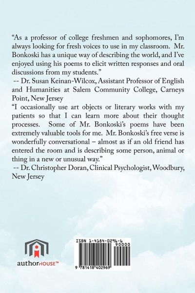 "As a professor of college freshmen and sophomores, I'm always looking for fresh voices to use in my classroom. Mr. Bonkoski has a unique way of describing the world, and I've enjoyed using his poems to elicit written responses and oral discussions by my students." -- Dr. Susan Keinan-Wilcox, Assistant Professor of English and Humanities at Salem Community College, Carneys Point, New Jersey "I occasionally use art objects or literary works with my patients so that I can learn more about their thought processes. Some of Mr. Bonkoski's poems have been extremely valuable tools for me. Mr. Bonkoski's free verse is wonderfully conversational - almost as if an old friend has entered the room and is describing some person, animal or thing in a new or unusual way." -- Dr. Christopher Doran, Clinical Psychologist, Woodbury, New Jersey