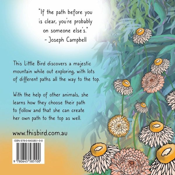 This Little Bird discovers a majestic mountain while out exploring, with lots of different paths all the way to the top. With the help of other animals along the way, she learns how they each choose a path to follow and that she too can create her own path to the top. "If the path before you is clear, you're probably on someone else's." - Joseph Campbell