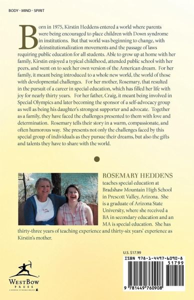 Born in 1975, Kirstin Heddens entered a world where parents were being encouraged to place children with Down syndrome in institutions. But that world was beginning to change, with deinstitutionalization movements and the passage of laws requiring public education for all students. Able to grow up at home with her family, Kirstin enjoyed a typical childhood, attended public school with her peers, and went on to seek her own version of the American dream. For her family, it meant being introduced to a whole new world, the world of those with developmental challenges. For her mother, Rosemary, that resulted in the pursuit of a career in special education, which has filled her life with joy for nearly thirty years. For her father, Craig, it meant being involved in Special Olympics and later becoming the sponsor of a self-advocacy group as well as being his daughter's strongest supporter and advocate. Together as a family, they have faced the challenges presented to them with love and determination. Rosemary tells their story in a warm, compassionate, and often humorous way. She presents not only the challenges faced by this special group of individuals as they pursue their dreams, but also the gifts and talents they have to share with the world.