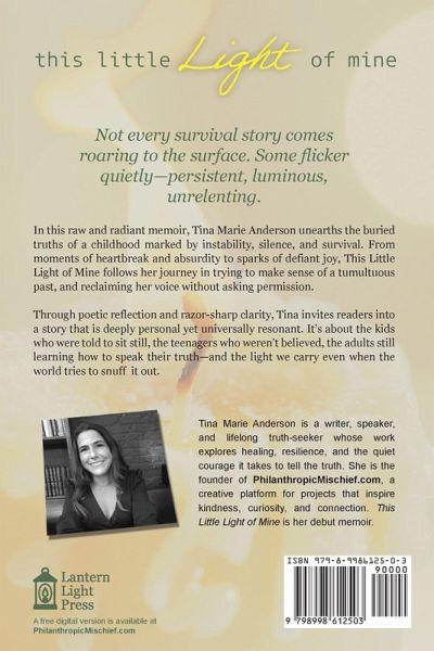 This Little Light of Mine is a deeply personal memoir of survival, estrangement, and the quiet, persistent strength it takes to reclaim your life from the shadows of childhood trauma. Tina Marie Anderson's story begins not in a nursery, but on the side of a Florida highway, where she and her toddler brother were found wandering alone-a haunting symbol of what was to come. Raised in a cycle of instability, control, and silence, Tina navigates a fractured family system marked by abandonment, abuse, and religious pressure. Yet through each chapter, she unearths meaning, sharpens her voice, and discovers that healing doesn't arrive all at once-it reveals itself in small flashes of truth, self-awareness, and reclaimed power. Told with emotional honesty, grit, and flashes of dry humor, This Little Light of Mine shines a light on the hidden realities of family dysfunction and the lifelong effects of early trauma-while offering a beacon of hope to others still finding their way through the dark. For readers of Tara Westover, Jennette McCurdy, and Chanel Miller, this memoir is a testament to what can happen when we stop trying to survive for others and start choosing ourselves.