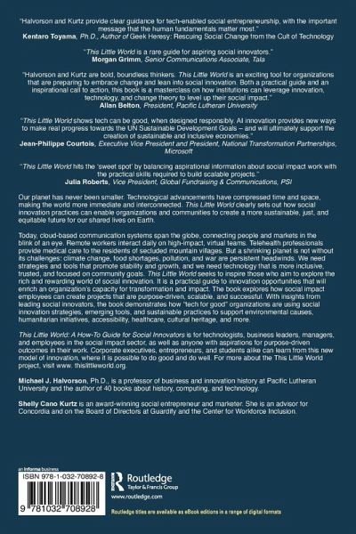Today, cloud based communication systems span the globe, connecting people and markets in the blink of an eye. Remote workers interact daily on high impact, virtual teams. Telehealth professionals provide medical care to the residents of secluded mountain villages. But a shrinking planet is not without its challenges: climate change, food shortages, pollution, and war are persistent headwinds. We need strategies and tools that promote stability and growth, and we need technology that is more inclusive, trusted, and focused on community goals.This Little World seeks to inspire those who aim to explore the rich and rewarding world of social innovation. It is a practical guide to innovation opportunities that will enrich an organization's capacity for transformation and impact. The book explores how social impact employees can create projects that are purpose driven, scalable, and successful. With insights from leading social innovators, the book demonstrates how "tech for good" organizations are using social innovation strategies, emerging tools, and sustainable practices to support environmental causes, humanitarian initiatives, accessibility, healthcare, cultural heritage, and more.