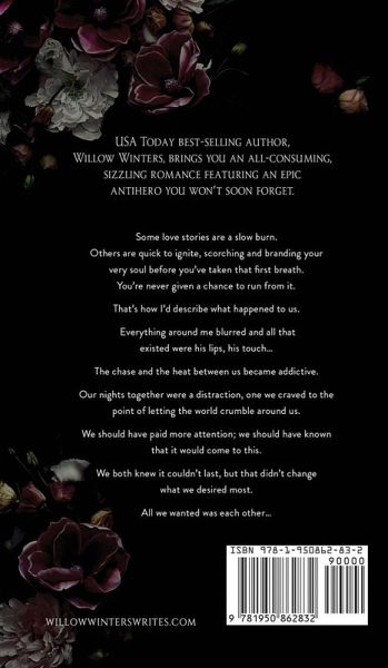 USA Today Best Selling Author, Willow Winters, brings you an all-consuming, sizzling romance featuring an epic, anti-hero you won't soon forget. Some love stories are a slow burn. Others are quick to ignite, scorching and branding your very soul before you've taken that first breath. You're never given a chance to run from it. That's how I'd describe what happened to us. Everything around me blurred and all that existed were his lips, his touch... The chase and the heat between us became addictive. Our nights together were a distraction; one we craved to the point of letting the world crumble around us. We should have paid attention; we should have known that it would come to this. We both knew it couldn't last, but that didn't change what we desired most. All we wanted was each other...