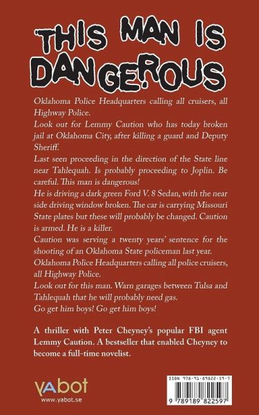 Oklahoma Police Headquarters calling all cruisers, all Highway Police. Look out for Lemmy Caution who has today broken jail at Oklahoma City, after killing a guard and Deputy Sheriff. Last seen proceeding in the direction of the State line near Tahlequah. Is probably proceeding to Joplin. Be careful. This man is dangerous! He is driving a dark green Ford V. 8 Sedan, with the near side driving window broken. The car is carrying Missouri State plates but these will probably be changed. Caution is armed. He is a killer. Caution was serving a twenty years' sentence for the shooting of an Oklahoma State policeman last year. Oklahoma Police Headquarters calling all police cruisers, all Highway Police. Look out for this man. Warn garages between Tulsa and Tahlequah that he will probably need gas. Go get him boys! Go get him boys! * * * A thriller with Peter Cheyney's popular detective Lemmy Caution. This is the first in a series of ten novels featuring the FBI agent Lemmy Caution. A bestseller that enabled Cheyney to become a full-time novelist.