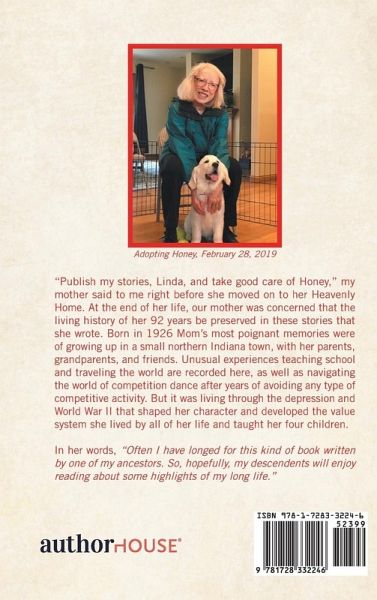 "Publish my stories, Linda, and take good care of Honey," my mother said to me right before she moved on to her Heavenly Home. At the end of her life, our mother was concerned that the living history of her 92 years be preserved in these stories that she wrote. Born in 1926 Mom's most poignant memories were of growing up in a small northern Indiana town, with her parents, grandparents, and friends. Unusual experiences teaching school and traveling the world are recorded here, as well as navigating the world of competition dance after years of avoiding any type of competitive activity. But it was living through the depression and World War II that shaped her character and developed the value system she lived by all of her life and taught her four children. In her words, "Often I have longed for this kind of book written by one of my ancestors. So, hopefully, my descendents will enjoy reading about some highlights of my long life."