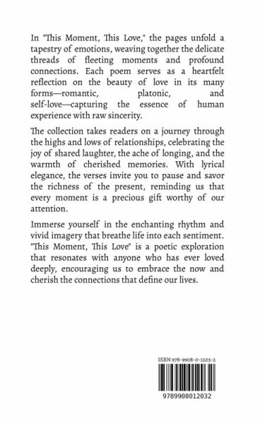 In "This Moment, This Love," the pages unfold a tapestry of emotions, weaving together the delicate threads of fleeting moments and profound connections. Each poem serves as a heartfelt reflection on the beauty of love in its many forms-romantic, platonic, and self-love-capturing the essence of human experience with raw sincerity. The collection takes readers on a journey through the highs and lows of relationships, celebrating the joy of shared laughter, the ache of longing, and the warmth of cherished memories. With lyrical elegance, the verses invite you to pause and savor the richness of the present, reminding us that every moment is a precious gift worthy of our attention. Immerse yourself in the enchanting rhythm and vivid imagery that breathe life into each sentiment. "This Moment, This Love" is a poetic exploration that resonates with anyone who has ever loved deeply, encouraging us to embrace the now and cherish the connections that define our lives.