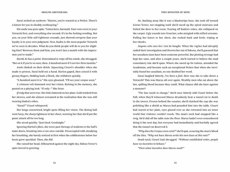 She knows the taste of death. He'll stoke her hunger for it. > Certain of his guilt, Sarai begins a double life: solving cases with Kadra by day and plotting his ruin by night. But Kadra is charming and there's something alluring about the wrath he wields against the city's corruption. So when the evidence she finds embroils her in a deadly political battle, Sarai must also fight against her attraction to Kadra--because despite his growing hold on her heart, his voice matches the only memory she has of her assailant... A dazzling Ancient Rome-inspired romantasy debut, This Monster of Mine is a bloodbath of manipulation, deception, and forbidden love.