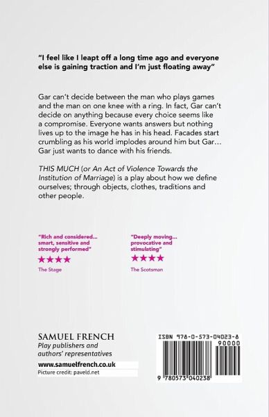"I feel like I leapt off a long time ago and everyone else is gaining traction and I'm just floating away" Gar can't decide between the man who plays games and the man on one knee with a ring. In fact, Gar can't decide on anything because every choice seems like a compromise. Everyone wants answers but nothing lives up to the image he has in his head. Facades start crumbling as his world implodes around him but Gar... Gar just wants to dance with his friends. THIS MUCH (or An Act of Violence Towards the Institution of Marriage) is a play about how we define ourselves; through objects, clothes, traditions and other people.