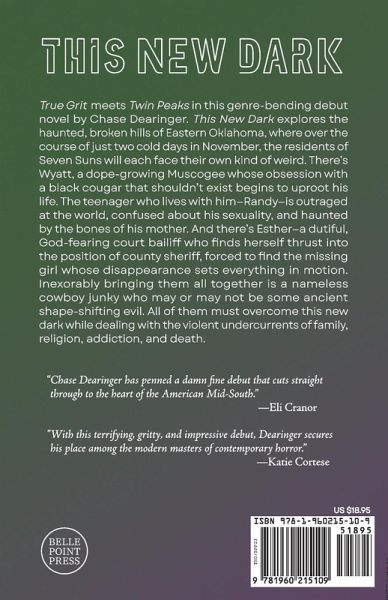 True Grit meets Twin Peaks in this genre-bending debut novel by Chase Dearinger. This New Dark explores the haunted, broken hills of eastern Oklahoma, where over the course of just two cold days in November, the residents of Seven Suns will each face their own kind of weird. There's Wyatt, a dope-growing Muscogee whose obsession with a black cougar that shouldn't exist begins to uproot his life. The teenager who lives with him-Randy-is outraged at the world, confused about his sexuality, and haunted by the bones of his mother. And there's Esther-a dutiful, God-fearing court bailiff who finds herself thrust into the position of county sheriff, forced to find the missing girl whose disappearance sets everything in motion. Inexorably bringing them all together is a nameless cowboy junky who may or may not be some ancient shape-shifting evil. All of them must overcome this new dark while dealing with the violent undercurrents of family, religion, addiction, and death.