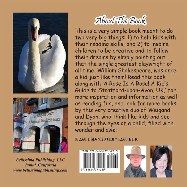 When Penelope Dyan saw the actual house where playwright William Shakespeare was born and grew up, she was nothing short of giddy. To see and hear docents dressed in costume take her through the house where Shakespeare was born, to walk where he walked, and to see where he played and where his father made leather gloves (as was his trade) and to look at the fireplaces and hearths where food was cooked and where William Shakespeare warmed his hands and feet, was an amazing experience for author, attorney and former teacher, Penelope Dyan . . . not to mention the excitement she experienced when she saw the bedroom where William Shakespeare was born and the likeness of his cradle! And to make things even more interesting, the lens of photographer John D. Weigand carefully captured this place, restored for posterity, right there in the quaint city of Stratford-upon Avon, a place with a magical past sure to inspire even the youngest of travelers! So have loads of fun practicing your reading skills through word recognition, repetition and rhyme, and see some of what what Dyan and Weigand saw as you read. Then go to the Bellissimavideo YouTube Channel to have even more learning fun watching the free music video that goes with this book!