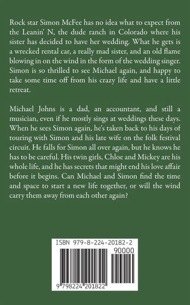 Rock star Simon McFee has no idea what to expect from the Leanin' N, the dude ranch in Colorado where his sister has decided to have her wedding. What he gets is a wrecked rental car, a really mad sister, and an old flame blowing in on the wind in the form of the wedding singer. Simon is so thrilled to see Michael again, and happy to take some time off from his crazy life and have a little retreat. Michael Johns is a dad, an accountant, and still a musician, even if he mostly sings at weddings these days. When he sees Simon again, he's taken back to his days of touring with Simon and his late wife on the folk festival circuit. He falls for Simon all over again, but he knows he has to be careful. His twin girls, Chloe and Mickey are his whole life, and he has secrets that might end his love affair before it begins. Can Michael and Simon find the time and space to start a new life together, or will the wind carry them away from each other again?