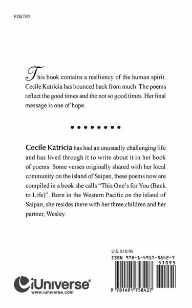 This book contains a resiliency of the human spirit. Cecile Katricia has bounced back from much. The poems reflect the good times and the not so good times. Her final message is one of hope.