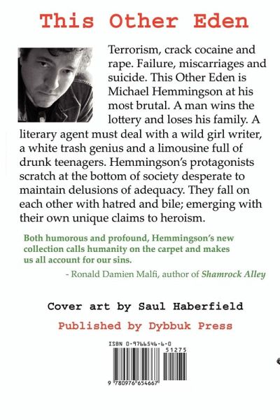 Terrorism, crack cocaine and rape. Failure, miscarriages and suicide. Divorce, incest and misery. This Other Eden is Michael Hemmingson at his most brutal. A man wins the lottery and loses his family. A book agent must deal with a wild girl writer, a white trash genius and a limousine full of angry teenagers. His protagonists scratch at the bottom of society desperate to maintain delusions of adequacy. They fall into each other with hatred and bile; emerging with their own unique form of heroism. Provocative and intriguing, THIS OTHER EDEN by Michael Hemmingson is akin to reading a cross between someone's private journal and a True Crime magazine. Feeling titillated and naughty, as if reading a sibling's most private and dirty secrets, I found myself wholly unwilling to put this book down. It is glorious train wreck of loss, betrayal, and crime mixed with intimate thoughts and a poignant sense of loneliness. THIS OTHER EDEN is the kind of book that will make you forget your own life for a while but will also allow you to be grateful for it when you put the book down. ~ Jennifer Brozek, Submissions Editor, Apex Book Company