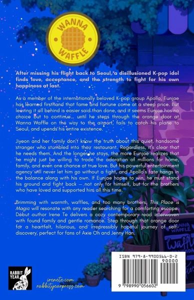 After missing his flight back to Seoul, a disillusioned K-pop idol finds love, acceptance, and the strength to fight for his own happiness at last. As a member of the internationally beloved K-pop group Apollo, Eunjae has learned firsthand that fame and fortune come at a steep price. But leaving it all behind is easier said than done, and it seems Eunjae has no choice but to continue... until he steps through the orange door at Wanna Waffle on the way to the airport, fails to catch his plane to Seoul, and upends his entire existence. Jiyeon and her family don't know the truth about this quiet, handsome stranger who stumbled into their restaurant. Regardless, it's clear that he needs them. And the longer he stays, the more Eunjae realizes that he might just be willing to trade the adoration of millions for home, family, and even one chance at true love. But his powerful entertainment agency will never let him go without a fight, and Apollo's fate hangs in the balance along with his own. If Eunjae hopes to win, he must stand his ground and fight back - not only for himself, but for the brothers who have loved and supported him all this time. Brimming with warmth, waffles, and too many brothers, This Place is Magic will resonate with any reader searching for a comforting escape. Debut author Irene Te delivers a cozy contemporary read interwoven with found family and gentle romance. Step through that orange door for a heartfelt, hilarious, and irrepressibly hopeful journey of self-discovery, perfect for fans of Axie Oh and Jenny Han.