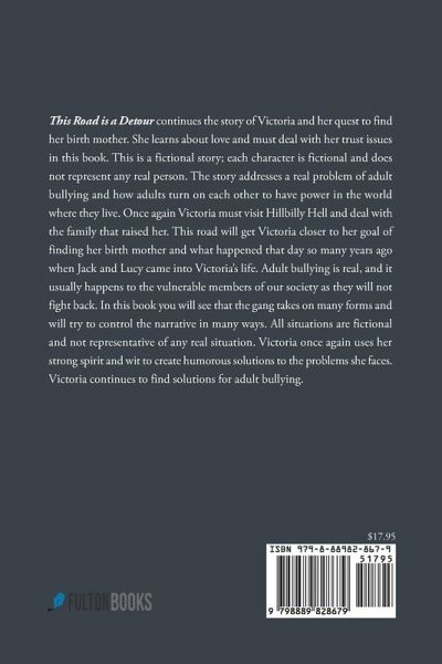 This Road is a Detour continues the story of Victoria and her quest to find her birth mother. She learns about love and must deal with her trust issues in this book. This is a fictional story; each character is fictional and does not represent any real person. The story addresses a real problem of adult bullying and how adults turn on each other to have power in the world where they live. Once again Victoria must visit Hillbilly Hell and deal with the family that raised her. This road will get Victoria closer to her goal of finding her birth mother and what happened that day so many years ago when Jack and Lucy came into Victoria's life. Adult bullying is real, and it usually happens to the vulnerable members of our society as they will not fight back. In this book you will see that the gang takes on many forms and will try to control the narrative in many ways. All situations are fictional and not representative of any real situation. Victoria once again uses her strong spirit and wit to create humorous solutions to the problems she faces. Victoria continues to find solutions for adult bullying.