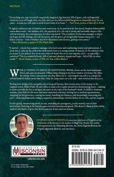 While trying to drum up additional work, down-on-his-luck handyman Don Lank spies an imitation Tiffany lamp shining in the front window of a house. He offers the elderly widow who answers the door $800 for it-knowing he can sell it to a dealer for several hundred dollars more than that. Only the lamp turns out to be real-and worth at least $15,000. Feeling both delighted by and guilty about his good fortune, Don returns most of the money to the original owner, Millie Prall. He also offers to make a few repairs around her deteriorating house-making it easier and safer for her to navigate the space in the wake of her husband's death. As Millie's dementia worsens, Don finds his life more and more enmeshed with hers, driving her to medical appointments, shopping for her groceries, cooking her meals, handling her finances, and increasingly overseeing her care-while simultaneously trying to repair his relationships with his father, his ex-wife, and his stepkids. In this quietly mesmerizing novel, no one, including the protagonist, is ever entirely sure of their motivations. Existing in the liminal spaces between altruism and greed, This Room Is Made of Noise deftly explores the shades of gray that lie between our desires and our demons.