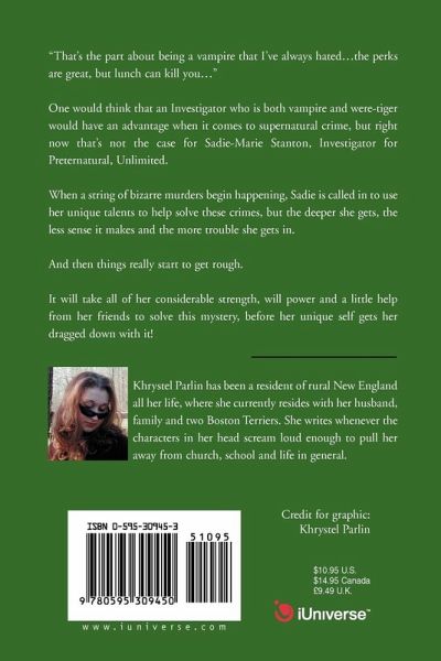 "That's the part about being a vampire that I've always hated... the perks are great, but lunch can kill you..." One would think that an Investigator who is both vampire and were-tiger would have an advantage when it comes to supernatural crime, but right now that's not the case for Sadie-marie Stanton, Investigator for Preternatural, Unlimited. When a string of bizarre murders begin happening, Sadie is called in to use her unique talents to help solve these crimes, but the deeper she gets, the less sense it makes and the more trouble she gets in. And then things really start to get rough. It will take all of her considerable strength, will power and a little help from her friends to solve this mystery, before her unique self gets her dragged down with it!