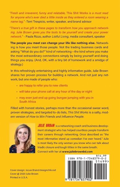 "Fresh and irreverent, funny and relatable, "This Shit Works" is a must read for anyone who's ever died a little inside as they entered a room wearing a name tag." -Terri Trespicio, writer, speaker, and brand advisor "There's a true gift in these pages to transform how you approach networking. Julie Brown gives you the tools to be yourself and create your power network." - Paula Rizzo, Author Listful Living, media consultant, speaker The people you meet can change your life like nothing else. Networking is how you meet those people. Not the trading business cards and asking "What do you do?" kind of networking-the kind where you make the most extraordinary connections simply by being yourself and doing things you enjoy. (And, OK, with a tiny bit of homework and a smidge of strategy.) In this refreshingly entertaining and highly informative guide, Julie Brown shares her proven process for building a network. And not just any network, but one made of people who: ¿ are happy to refer you to new clients ¿ will take your phone call at any hour of the day or night ¿ may even just end up going bungee jumping with you in South Africa. Filled with honest stories, perhaps more than the occasional swear word, proven strategies, and targeted to-do lists, This Shit Works is a salty, modern version of How to Win Friends and Influence People.